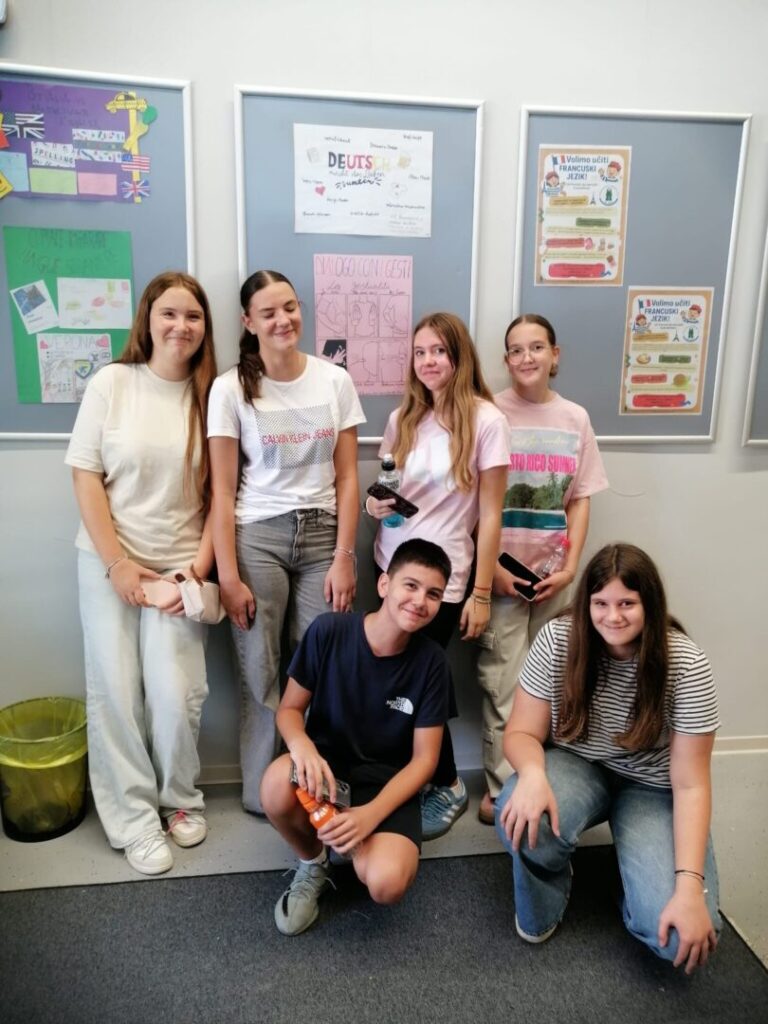 Naši učenici su se predstavili u prvom dijelu programa – IZLAGANJE POSTERA NA STRANIM JEZICIMA koji se uče u našoj školi kao izborni jezici s temom – VOLIMO UČITI STRANE JEZIKE gdje je trebalo kratko i šaljivo prikazati užitak učenja stranog jezika.